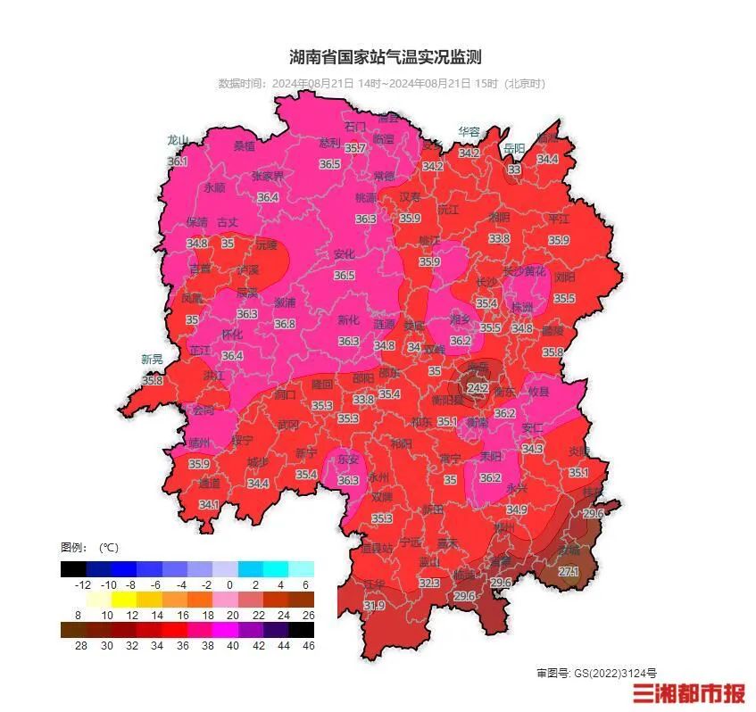 根据湖南省国家站最高气温实况监测显示,8月21日14时至15时,湖南大部气温在35℃至37℃之间,湘东南局地气温略偏低,在30至34℃左右。处暑将至,为何湖南高温为何卷土重来?