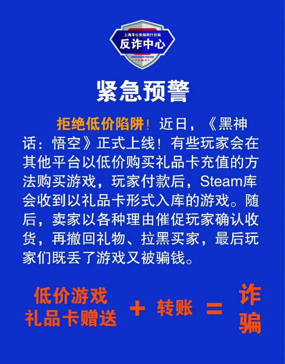 武汉市反电信网络诈骗中心介绍,当天,B站一UP主发布视频,称收到多位受害者投稿,在某二手平台购买的《黑神话:悟空》遭到卖家诈骗。