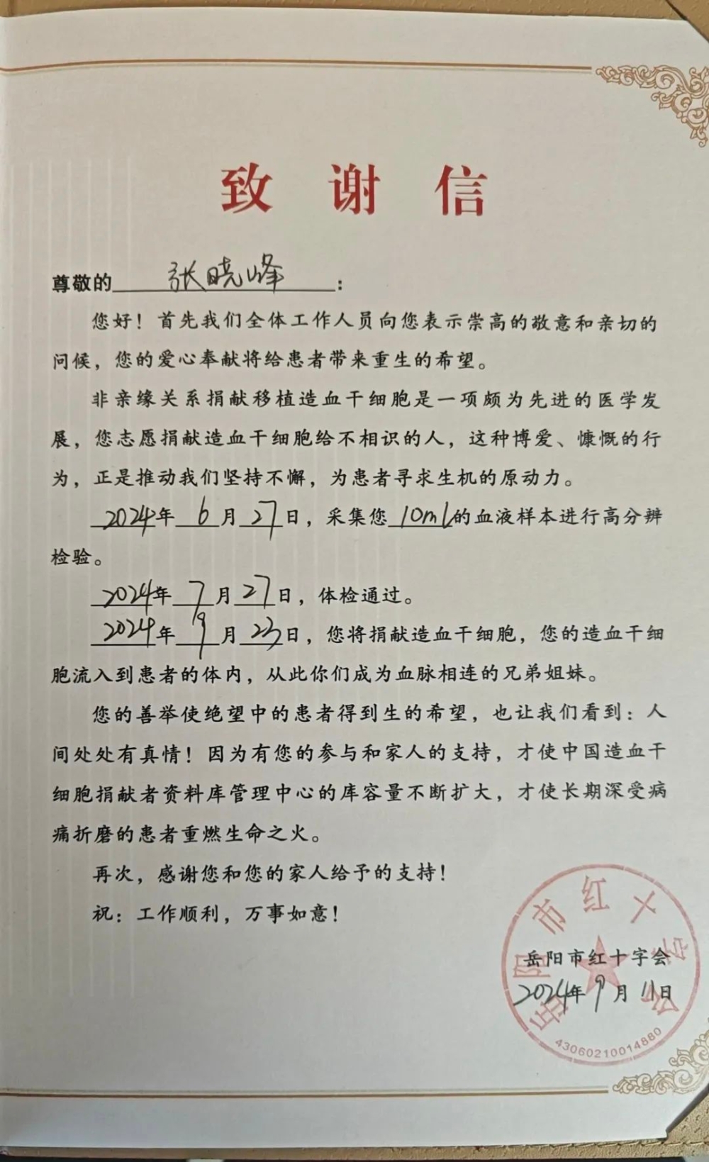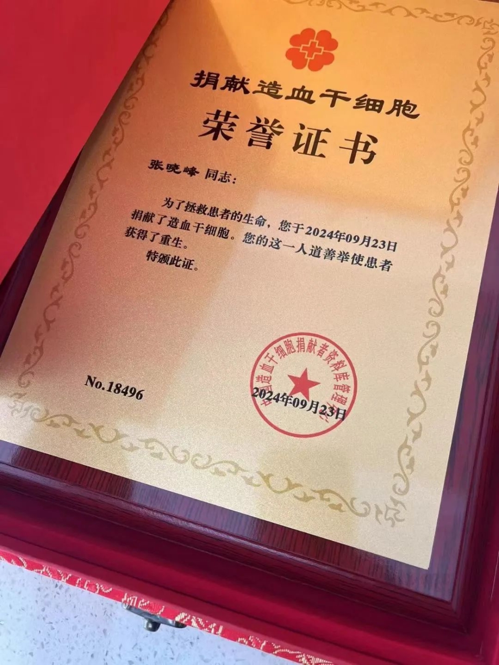 谈起捐献的感受,张晓峰说:“作为一名退伍军人,能够通过这种方式救一条鲜活的生命,给他人送去希望,是一件很荣幸的事。今后,会继续发挥退伍军人的本色,只要群众有需要,就会义不容辞。”