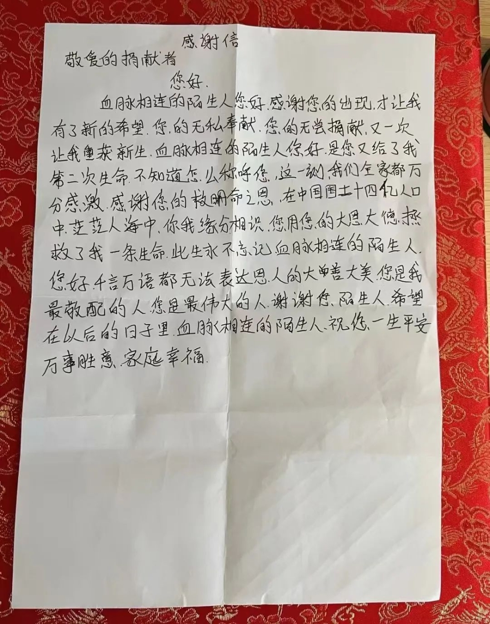 “血脉相连的陌生人,感谢您的出现,才让我有了新的希望,又一次让我重获新生......”完成捐献后,李杰收到了一封来自受捐献方的感谢信。对方朴实的话语,让李杰心里暖暖的。他说,只要人民有需要,就会义无反顾地去帮助,保持退伍军人的精神,退伍不褪色。