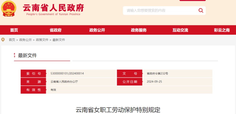 《云南省女职工劳动保护特别规定》近期正式公布,该《规定》自2024年11月1日正式执行。