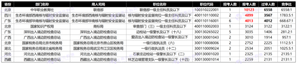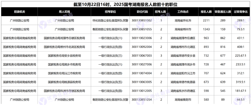 截至10月22日16时,2025国考报名人数最多前十职位。图片来源:优而仕教育