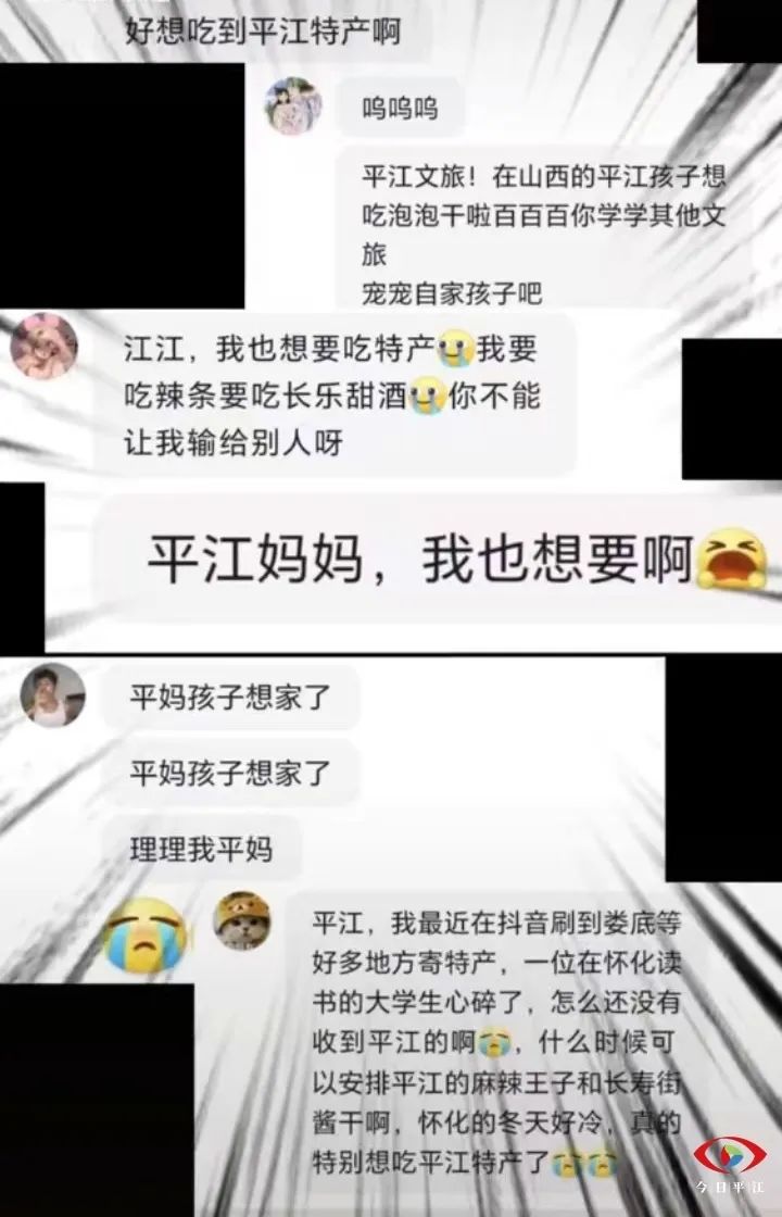 在外求学的平江学子们也纷纷在“今日平江”“平江文旅”等账号留言喊话:“好想吃到平江特产啊!”有的还“哭诉”:“自己为啥没有?”