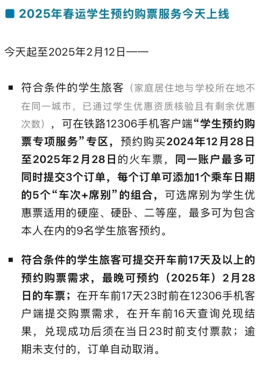 同时,针对近年来学生旅客与父母在异地团聚的情况逐渐增多的现状,国铁集团对2025年寒假期间(1月1日至3月31日)的学生优惠票发售和查验规则进行优化调整。