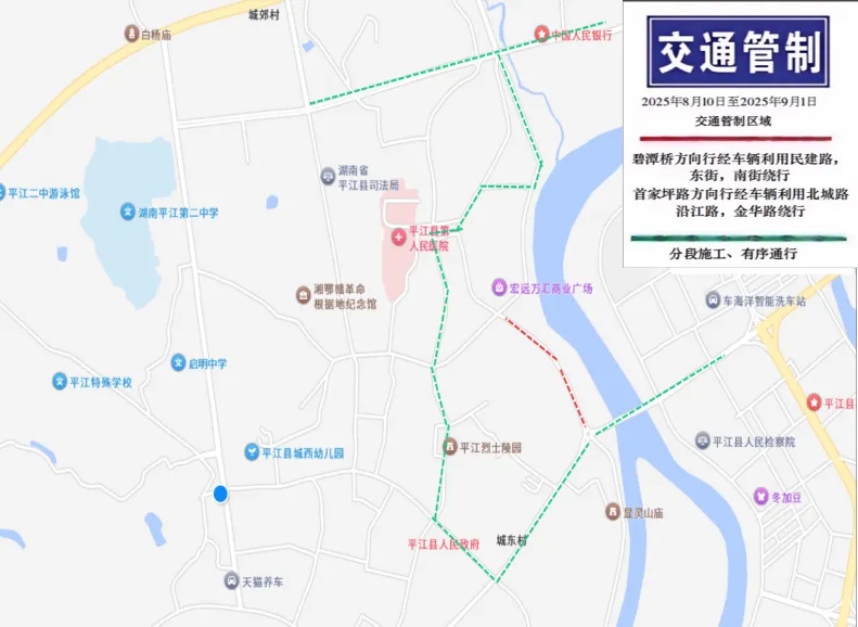 民建路:万汇路口至碧潭桥施工段(全幅分段封闭施工),时间:8月10日至9月1日