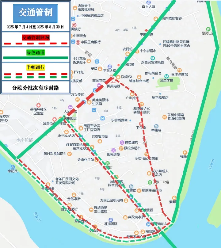大桥西路:民建路路口至平江大桥半幅:(半幅分段封闭施工),时间:7月4日至8月30日