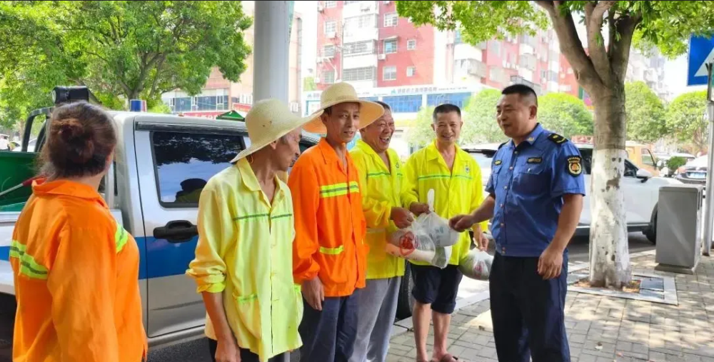 在天岳大道,县城管局为一线环卫工人发放降温良药包,“我们给大家发放绿豆、矿泉水和防暑药品,也会加强巡查,确保每位工友的作业安全。”