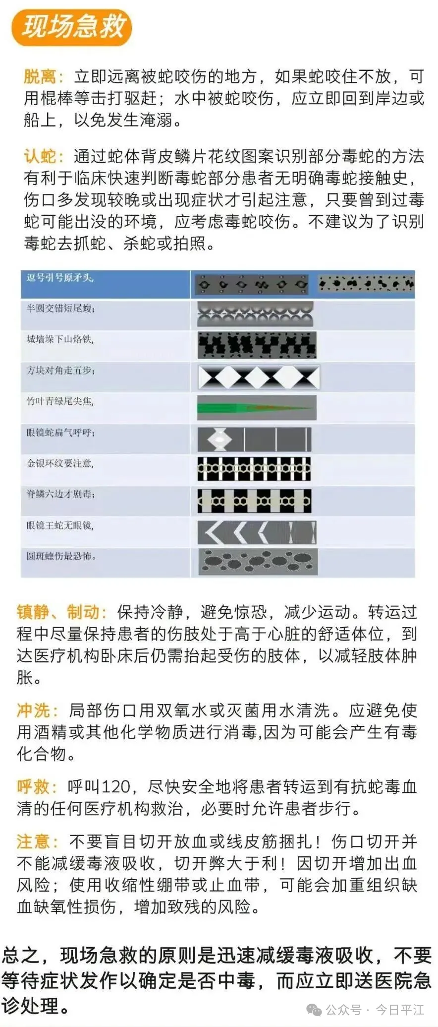 医生强调:被咬伤后1~2小时内,应立即拨打120急救电话,告知是被蛇咬伤,尽早到达距离最近的有抗蛇毒血清的医疗机构进行治疗。因为被蛇咬伤后救治越早,进入人体的毒液越少,靶器官受损程度就越小,预后越佳。