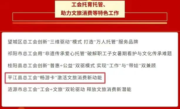 近日,湖南省总工会围绕创新实施全总“559”工作部署,发布2025年第三季度湖南工会重点工作创新案例,供各级工会和职工学习借鉴。在此次发布的创新案例中,平江1项重点工作入选。