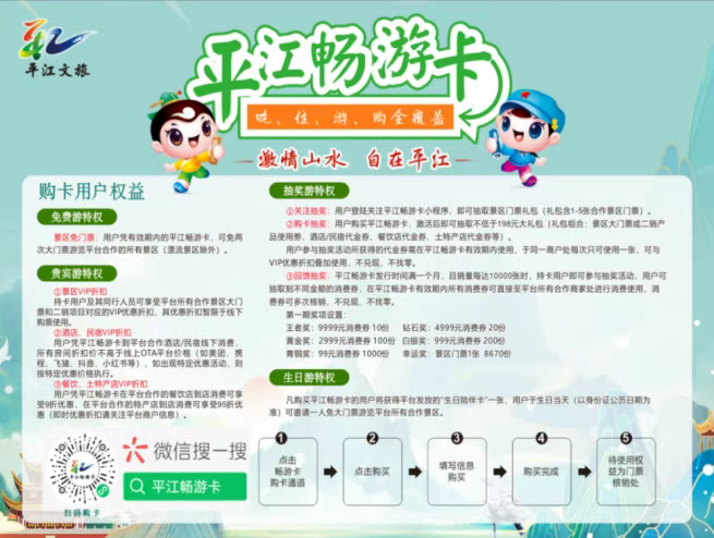 如今,“平江畅游卡”已成为激活平江文旅消费的新动能。大家不妨到“平江畅游卡”小程序看看,购买畅游卡,开启一场精彩的平江之旅!(雷怡慧)