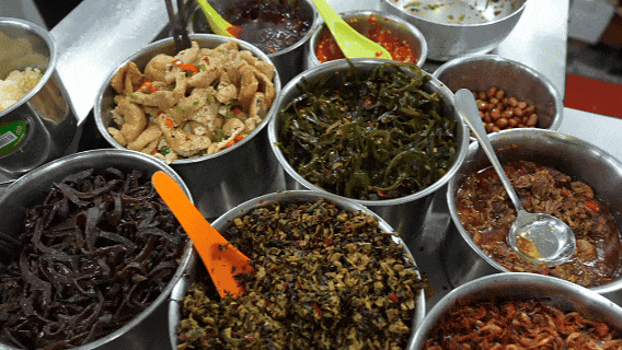 平江人吃面,对“臊子”的讲究堪称极致。一家面馆,“臊子”好不好吃,往往是食客评判的重要标准。炸得酥脆的花生米、细切的白灼肉丝、香油拌好的木耳丝、自家腌制的剁辣椒……几十种盆盆碗碗摆开,任君挑选,甚至随季节变换,春吃嫩笋,冬吃腌菜。