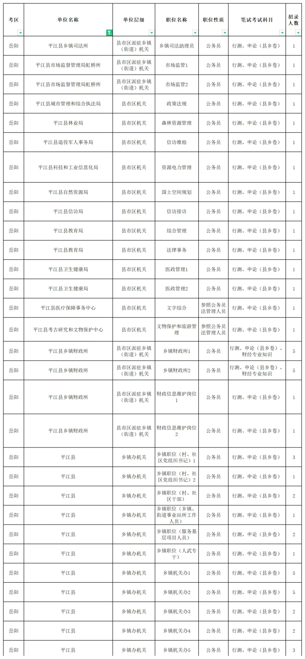 报考人员可登录https://www.pingjiang.gov.cn/35048/35072/72084/content_2353909.html查阅具体的招录单位、职位人数和报考资格条件。