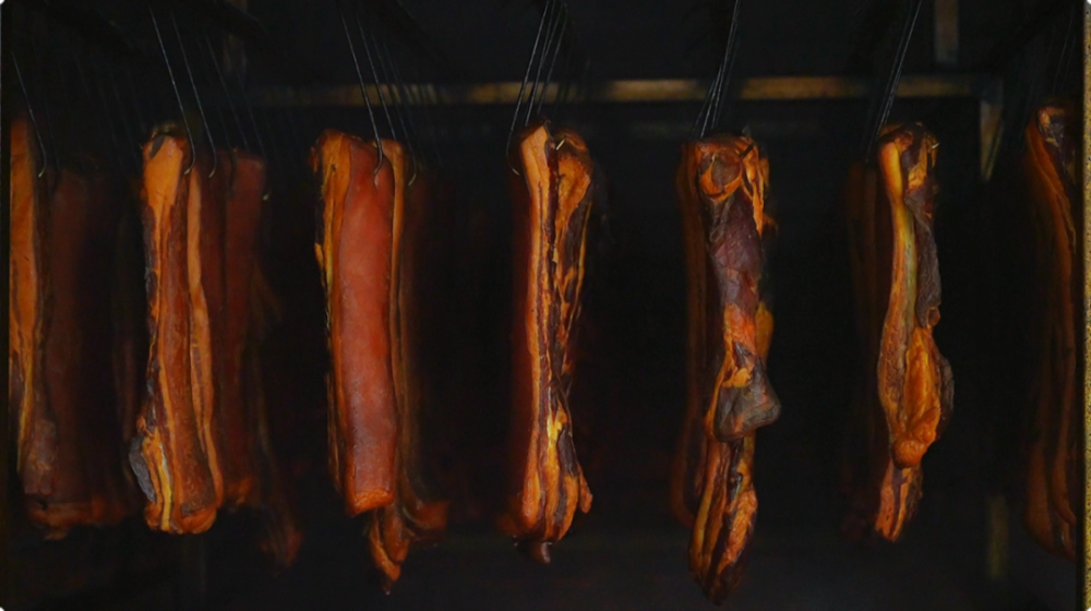 它在屋檐下渐次挂起的腊货上——经过盐的浸润与松烟的慢熏,鸡鸭鱼肉泛出油亮的琥珀色。梁下悬着的串串金黄,是富足,也是时间的沉淀。