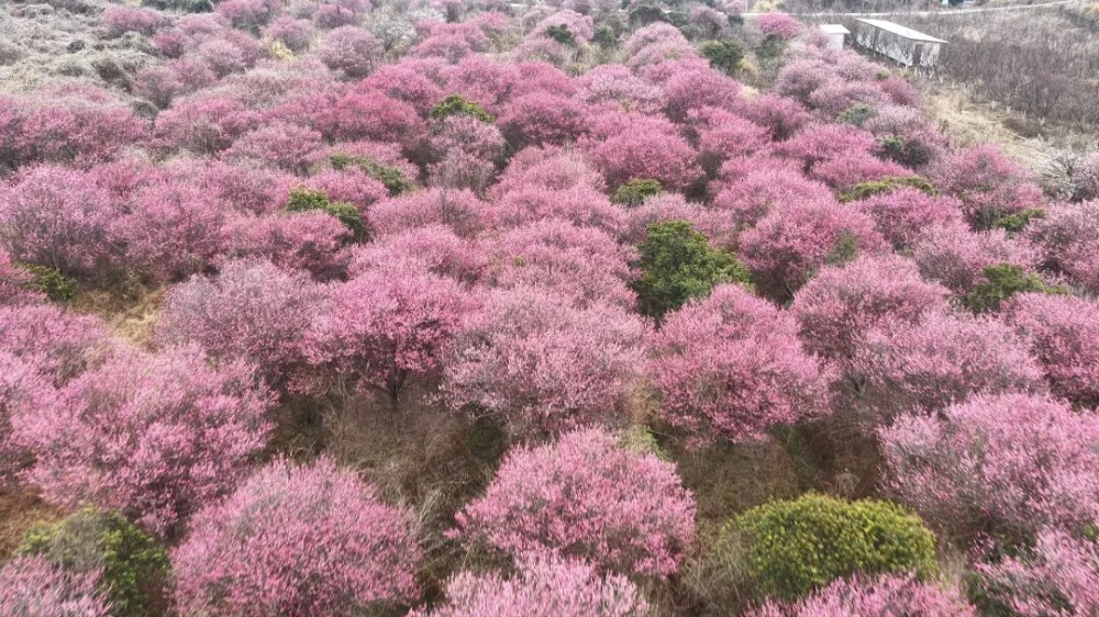 在平江浯口镇西江村,成片的红梅在立春时节渐次盛放。
