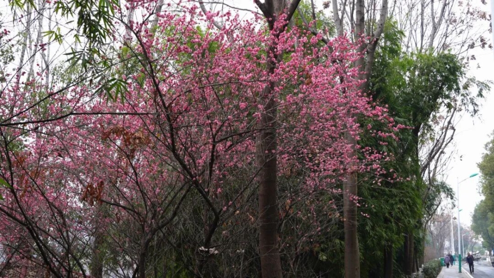 漫步县城的沿江风光带,一株株红梅竞相怒放,粉色的花朵玲珑小巧,如云似锦,分外妖娆,随风吹过,花香满途。