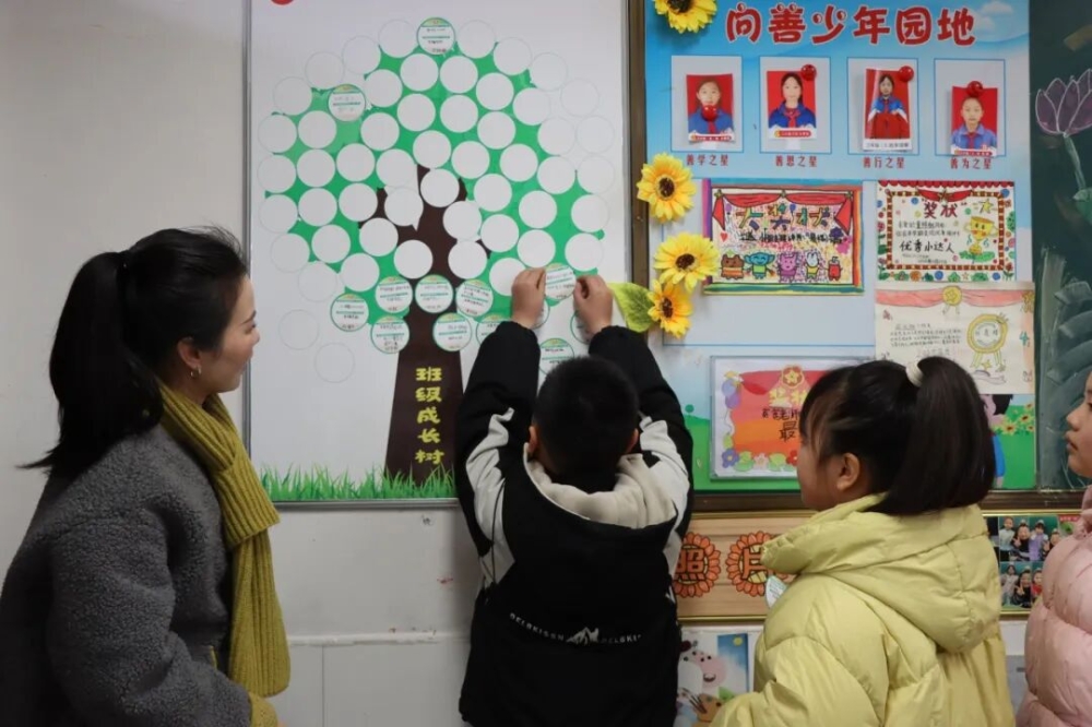 三阳明德学校各班精心打造“班级成长树”。孩子们带着对未来的企盼在卡片上写下了自己新学期的心愿,并张贴在树上。一个个心愿犹如春天的小花摇曳绽放。