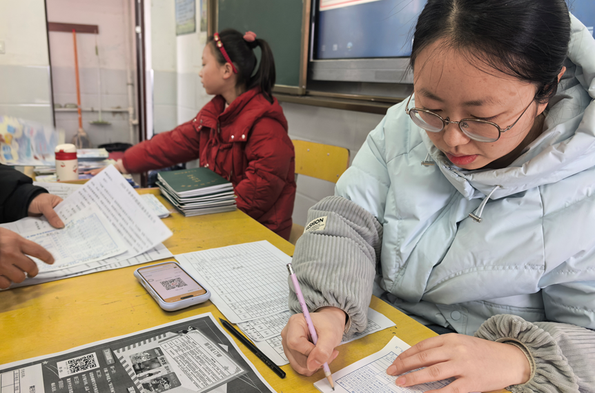 浯口中心小学的教室装扮一新,老师们细致严谨地检查寒假作业,旁边的学生也在帮着忙,眼神里满是对新学期的期待。
