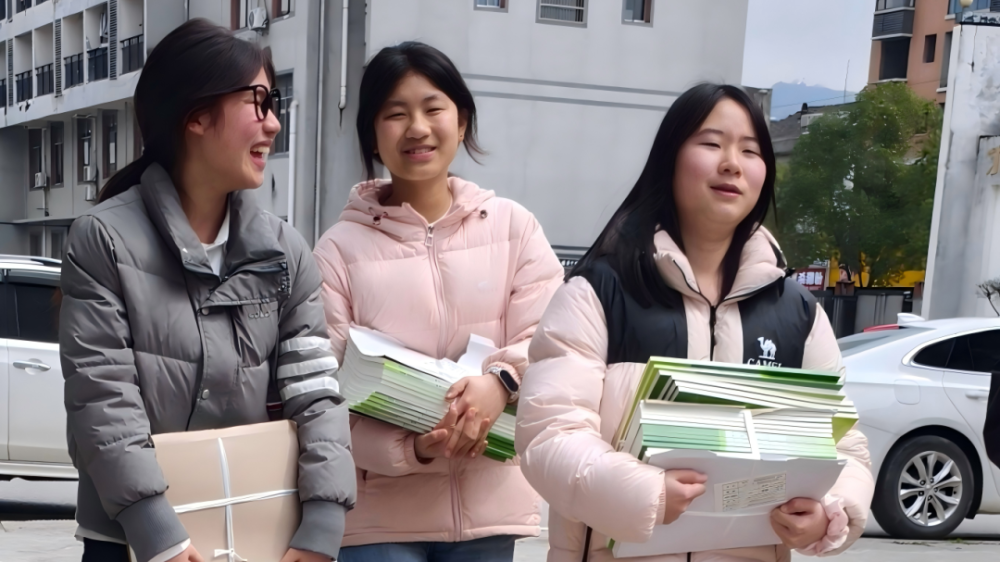 平江十中的校园里,学生们抱着新领取的课本互相交流,以笑容迎接新学期的到来。