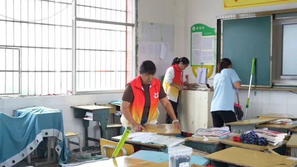 但重建的速度比预想中来得更快——当晚,县政府就召开调度会,教育部门连夜拿出维修方案,第二天上午施工队就进场维修。同时,志愿者们扛着工具来了,学生家长们自发组队来了,大家默契分工,有的戴着手套清理碎玻璃,有的合力擦拭桌椅,有的拿着扫帚清扫积水,有的爬上梯子修补门窗。“娃娃们的安全第一,我们搭把手,学校就能早一天复课。”一位家长一边搬运受损桌椅,一边朴实的话语道出了大家的心声。