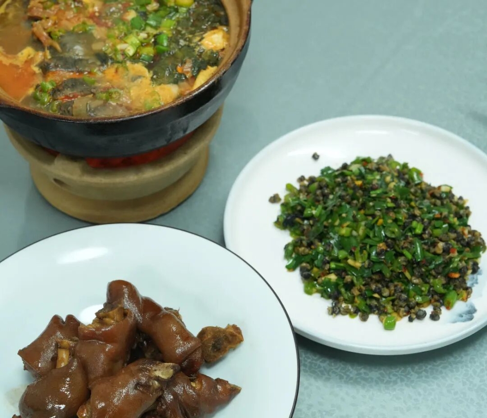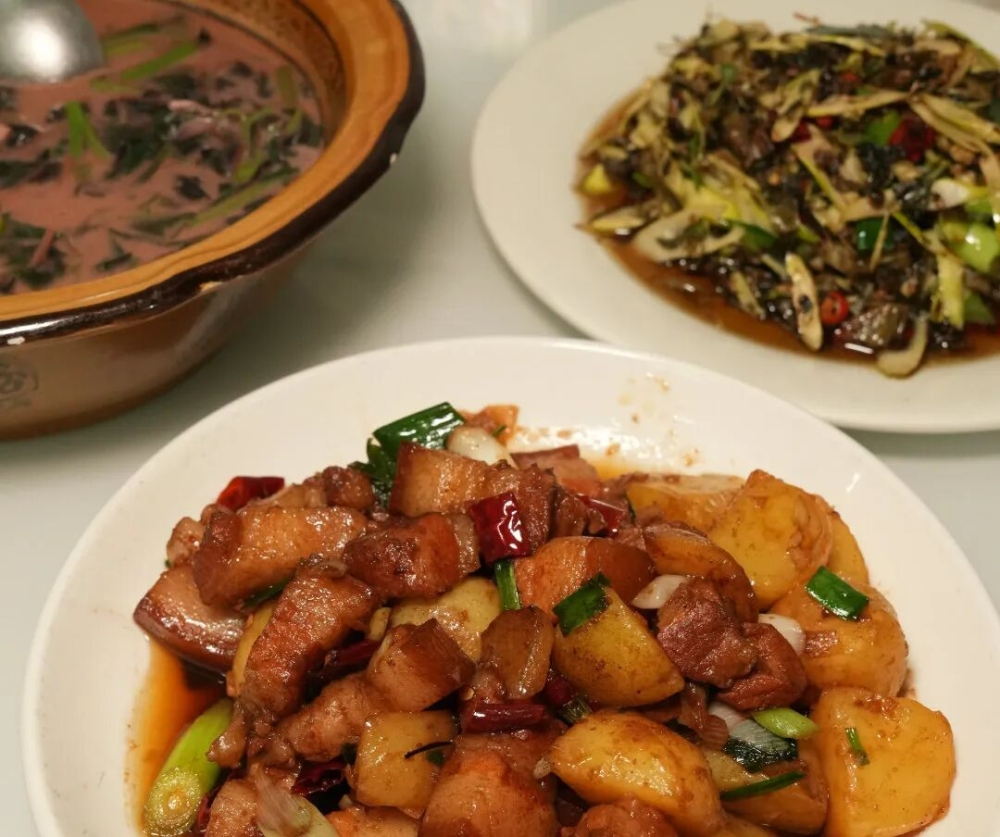 酸辣猪肠脆嫩爽口,小鱼焖豆腐汤汁醇厚,红烧肉焖土豆软糯入味,每道菜都超级下饭。