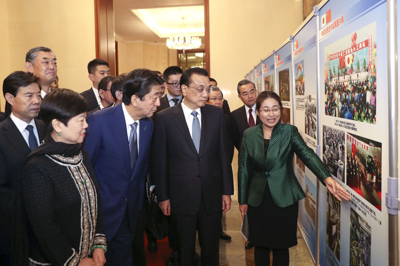 10月25日下午,李克强总理和日本首相安倍晋三在这里参观展览,随后共同出席了纪念中日和平友好条约缔结40周年招待会。来自两国各界约800名代表人士出席招待会。