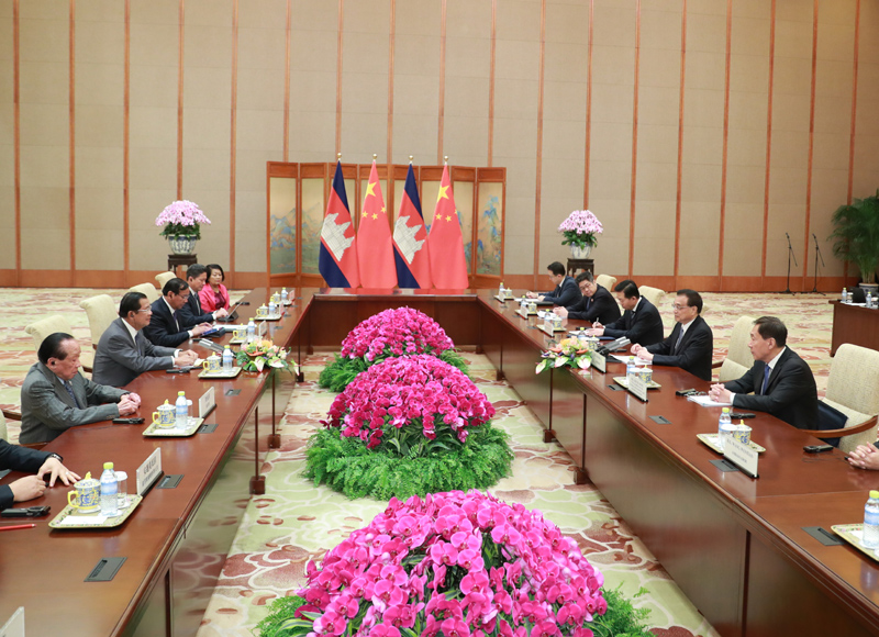 李克强表示,中柬传统友谊深厚。中国作为柬埔寨的友好邻邦,愿同柬方深化政治互信,推动各领域务实合作,共建“一带一路”,携手打造具有战略意义的命运共同体,推动双边关系向更高水平发展。中方高度重视发展对柬关系,支持柬提高自身发展能力,实现多元化发展。中方鼓励本国企业赴柬投资,愿扩大进口柬优势农产品。中方将全力支持柬方办好2020年亚欧首脑会议。