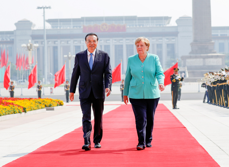 会谈前,李克强在人民大会堂东门外广场为默克尔举行欢迎仪式。