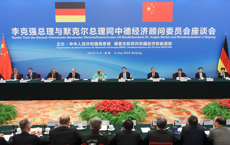 国务院总理李克强9月6日上午在人民大会堂与德国总理默克尔共同出席中德经济顾问委员会座谈会,并同与会代表交流。
