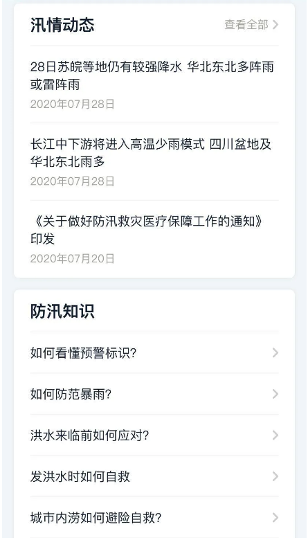 为帮助灾情严重地区群众及时掌握灾害预警信息实时了解水情信息,提前做好防备;同时帮助大家普及防汛知识,防患未然,国务院客户端小程序联合水利部制作了防汛服务专区。