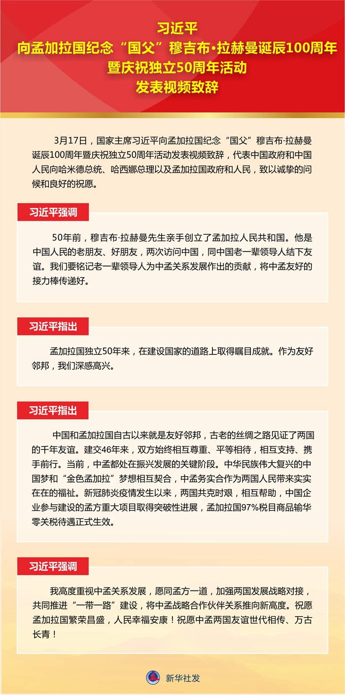 新华社北京3月17日电 3月17日,国家主席习近平向孟加拉国纪念“国父”穆吉布·拉赫曼诞辰100周年暨庆祝独立50周年活动发表视频致辞,代表中国政府和中国人民向哈米德总统、哈西娜总理以及孟加拉国政府和人民,致以诚挚的问候和良好的祝愿。