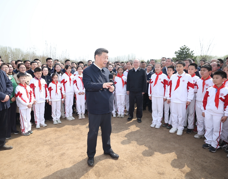 4月3日,党和国家领导人习近平、李强、赵乐际、王沪宁、蔡奇、丁薛祥、李希、韩正等来到北京市通州区潞城镇参加首都义务植树活动。这是习近平同少先队员在一起。新华社记者 鞠鹏 摄