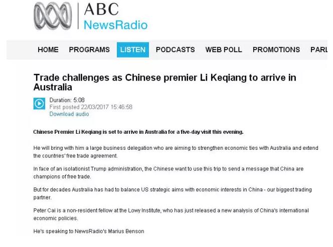 澳大利亚广播公司发表评论称,李克强访问澳大利亚将加强两国之间的经贸关系,重申中国反对贸易保护主义的立场。
