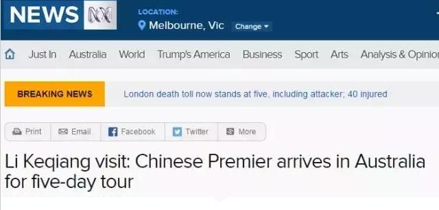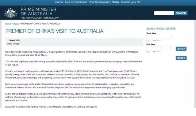 澳大利亚“总理官网”在访问前几天,就发文欢迎李克强总理。