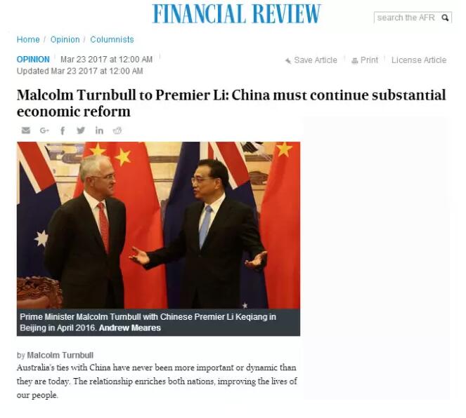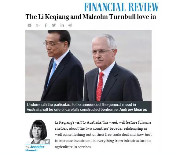 《澳洲金融评论报》表示,李克强总理此次访澳,将会让自贸协定更上一个台阶。