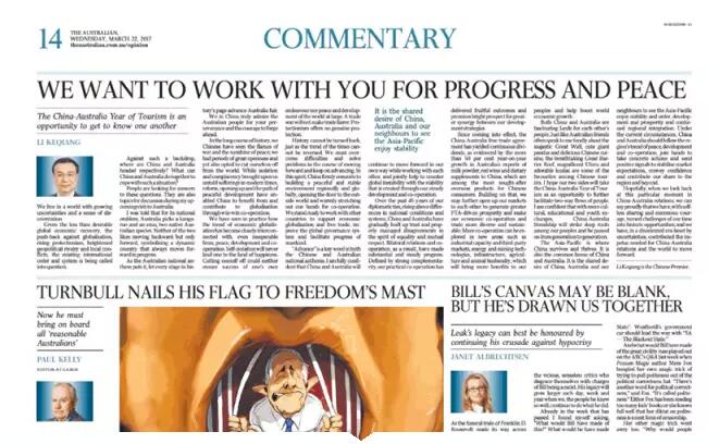 与此同时,李克强总理在《澳大利亚人报》发表署名文章称,前进是我从中澳两国国歌中听到的关键词。