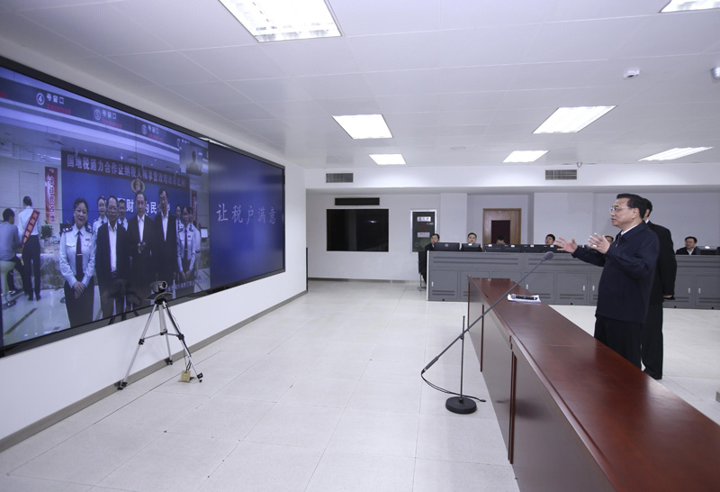 图为2016年4月1日李克强总理在税务总局信息系统监控室通过远程电视电话系统和珠海税务工作人员交谈。(中新社 刘震 摄)