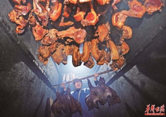 1月9日,麻阳苗族自治县苗乡情食品有限公司,村民在烘烤腊肉。随着电商物流的快速发展,这些苗乡人家的美食也逐渐“走”出深山,成为人们舌尖上的美味,同时也成为苗族同胞增收致富的新亮点。 湖南日报·华声在线记者 李健 通讯员 滕珊珊 摄影报道