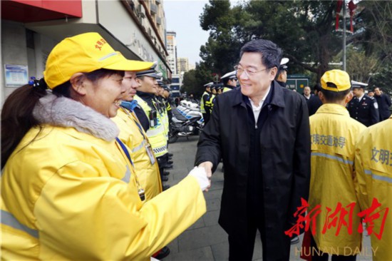 来到文艺路口、黎托环卫所等地,杜家毫与执勤交警、文明交通劝导员、城管队员、环卫工人一一握手,互致新春问候。他说,无论酷暑严寒、刮风下雨,大家全年无休坚守在保安保畅保洁第一线,十分辛苦。正是有了你们的疏导劝导,才让交通出行更加安全、有序;正是有了你们的辛勤付出,才让这座城市更加温馨、靓丽,你们不愧为交通安全的“守护者”、城市环境的“美容师”。走进中南大学湘雅二医院门诊大楼,杜家毫查看接诊情况,了解春节期间值班安排,他叮嘱医护人员,越是节日期间,越要精心照顾好病人特别是住院病人,让他们感受到节日的温馨。