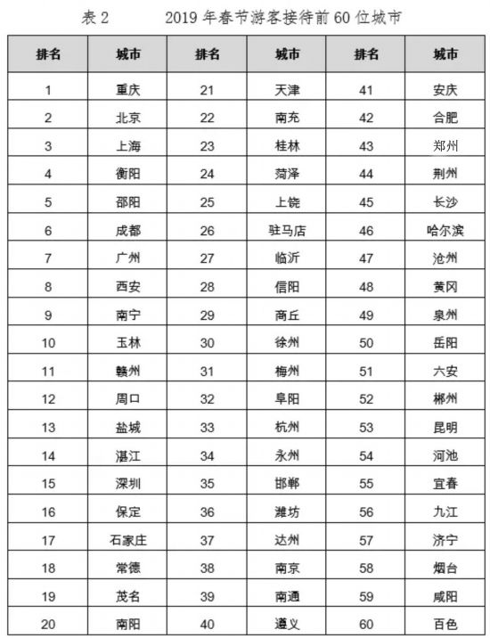 在2019年春节游客接待前60位城市中,湖南有衡阳、邵阳、常德、永州、长沙、岳阳6个城市入榜。数据来源:中国旅游研究院
