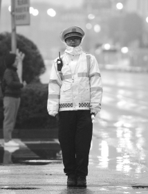 2月17日,长沙持续低温雨水天气,不管是骑自行车、电动车的市民,还是执勤的 交警,都把自己裹得严严实实。组图/记者辜鹏博