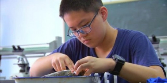 在实验室里,黄奕远正在认真地解剖鲫鱼。
