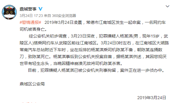 经公安机关初步调查,3月23日深夜,犯罪嫌疑人杨某淇(男,现年19岁,武陵区人)搭乘网约车从武陵区前往江南城区。3月24日0时左右,在江南城区大湖路常南汽车总站附近下车时,坐在后排的杨某淇乘司机陈某不备,朝陈某连捅数刀,致陈某死亡。据杨某淇供述,其因悲观厌世早有轻生念头,当晚因精神崩溃无故将司机陈某杀害。