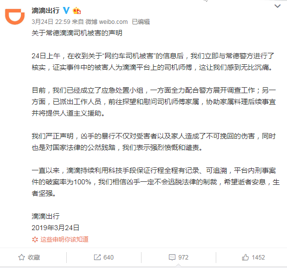 滴滴出行企业官方微博昨晚发布声明,证实被害人为滴滴平台上的司机师傅,滴滴方面已成立应急处置小组,一方面全力配合警方展开调查工作;另一方面已派出工作人员前往探望和慰问司机师傅家属。