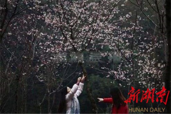 (图为湖南省森林植物园樱花绽放,市民争相拍照留念)