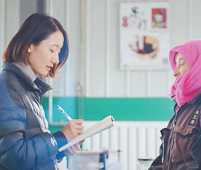 贵州分社记者程焕(左一)在贵州晴隆县的阿妹戚托小镇,采访新市民服务中心工作人员。