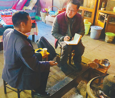 河北分社记者史自强(左)在河北承德市滦平县于营村牛圈子沟,采访当地贫困户。