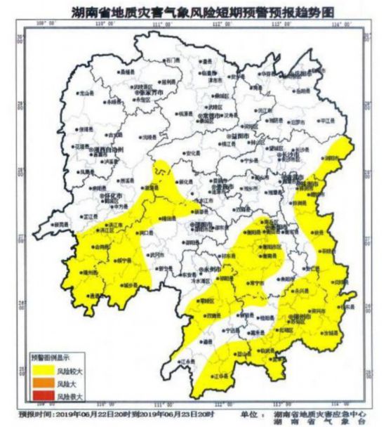 根据湖南省气象台2019年6月22日短期气象预报情况,湖南省地质灾害应急中心与湖南省气象台联合会商得出如下结论:自6月22日20:00至23日20:00,受降雨影响, 湘东、湘东南、湘中、湘西南、湘南大部分区域发生突发性地质灾害风险较大(黄色预警)。