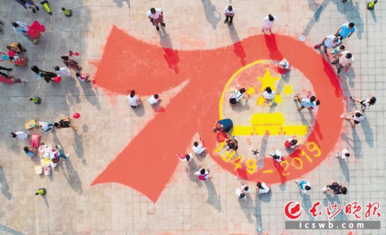 这面沙画完工后边长约15米,面积约225平方米,中间的“70”字样由五星红旗和天安门图案组成,象征着新中国成立70周年,下方还有红色的“中华人民共和国成立70周年”字样。经过居民群众两个小时的齐心绘制,巨幅沙画呈现眼前。鲜艳的红黄色,精巧的设计,引来大量市民和游客驻足欣赏,大家直呼壮观。(记者 洪虹 邹麟 实习生 苏苡 通讯员 刘涛然 马融融 摄影报道)