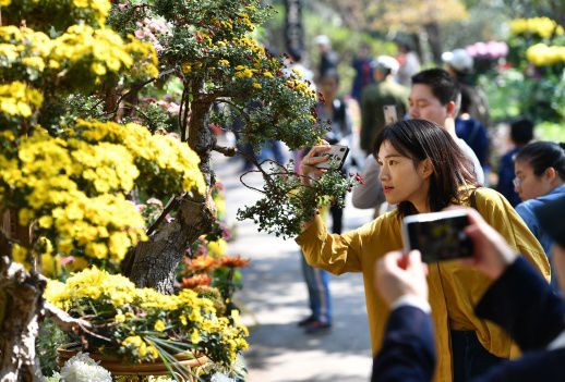 11月9日,长沙市岳麓山风景名胜区HI·悦麓观景台,游客在拍摄菊花。当天,2019年岳麓山菊花展开展,共展出约15000盆各类菊科花卉。所有展出花卉皆为景区菊花圃栽培产品,体现了岳麓山养菊技艺和长沙悠久的菊文化。 湖南日报记者 田超 摄