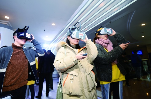 11月29日上午,2019中国新媒体大会场外互动区,与会代表在体验5G+VR智能一体机。(记者田超 傅聪 摄影报道)